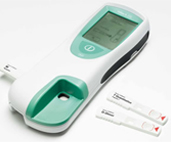 このため、針を刺す痛みも少なく、患者さんからは好評です。過去1~2ヶ月間の平均血糖値を示すヘモグロビンA1cを約2分で測定します。