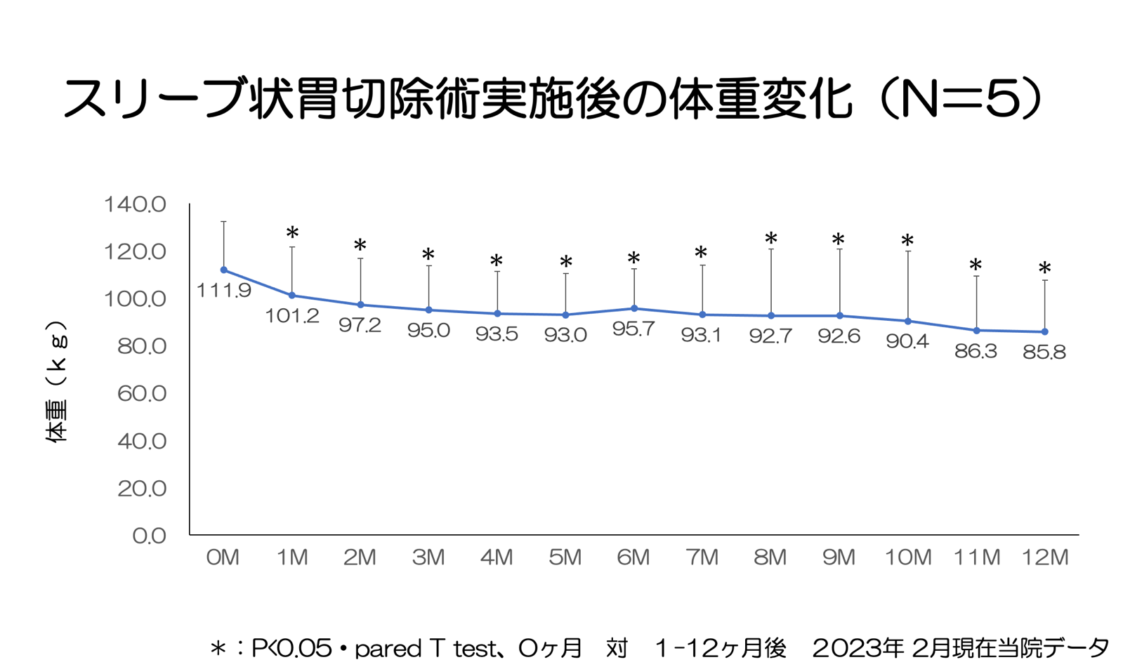 以下に最近手術を受けられた5名の方の1年間の減量効果を示します(1年後は手術時より平均で23%の有意な減量効果が統計学的に認められます)。